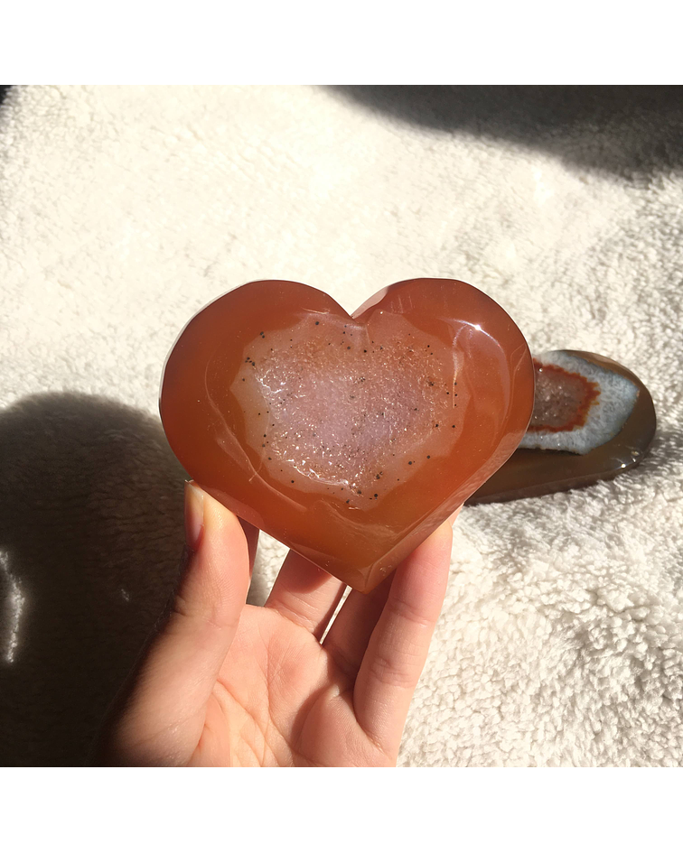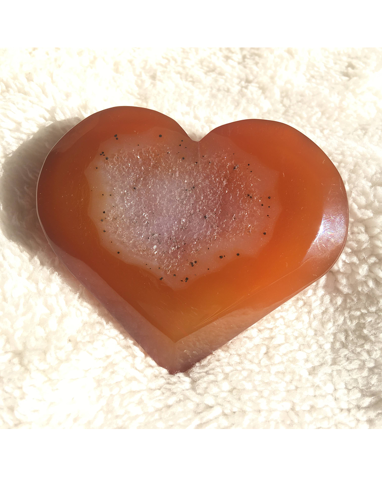 El ágata cornalina conecta con la energía sexual y creadora del segundo chakra. Pieza de colección única con drusa en forma de corazón.
