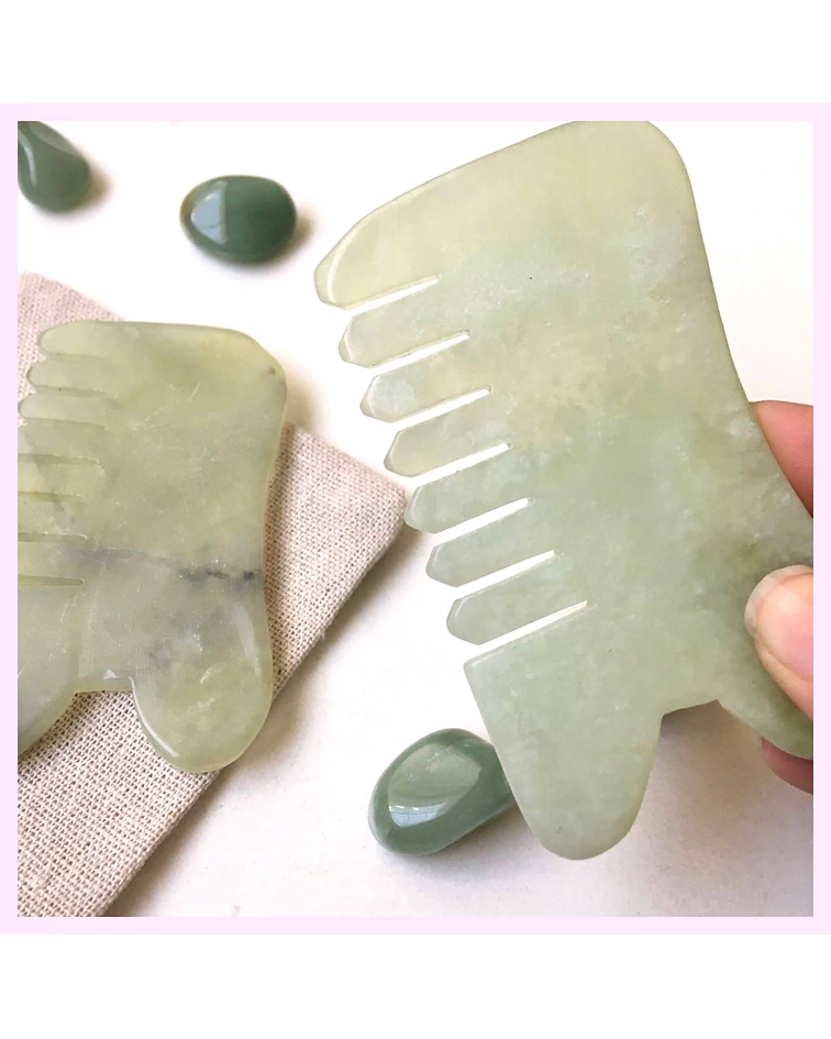 La guasha es una técnica empleada desde la antigua China para mejorar la salud, circulación de la sangre y vitalizar la piel. Con sus distintos ángulos masajea cara y cuerpo. Además incluye una sección dentada que puede funcionar como peineta y para masaje craneal.