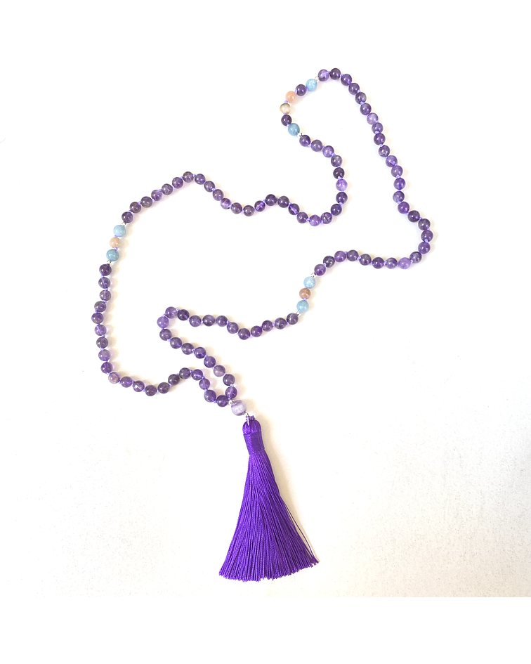 Descubre nuestro Japa Mala de 108 cuentas, diseñado para facilitar la comunicación con los ángeles y la divinidad. Este hermoso collar está compuesto por piedras naturales de aguamarina, amatista y piedra del sol, conocidas por sus propiedades energéticas. Estas piedras promueven una conexión más profunda con el mundo espiritual.