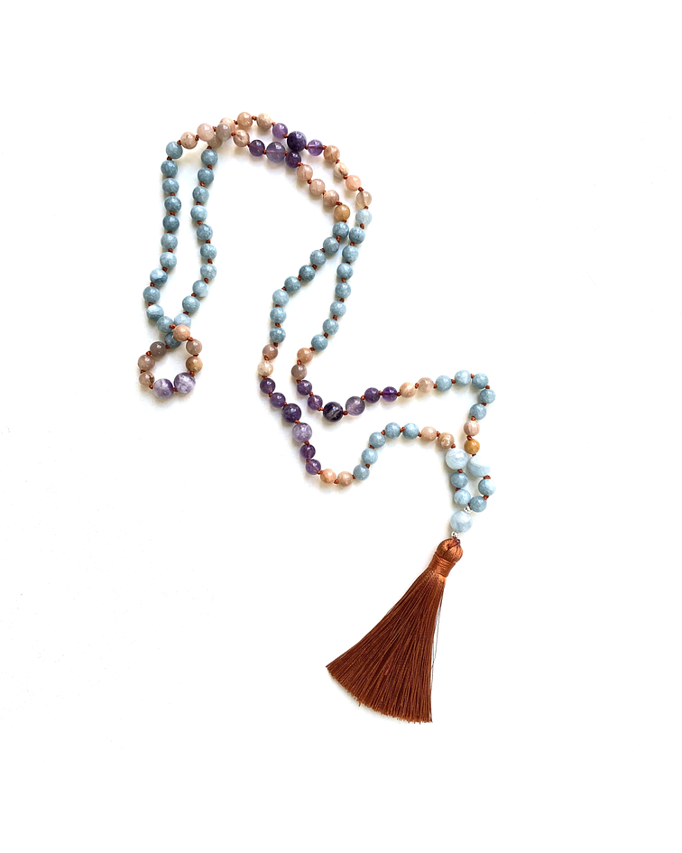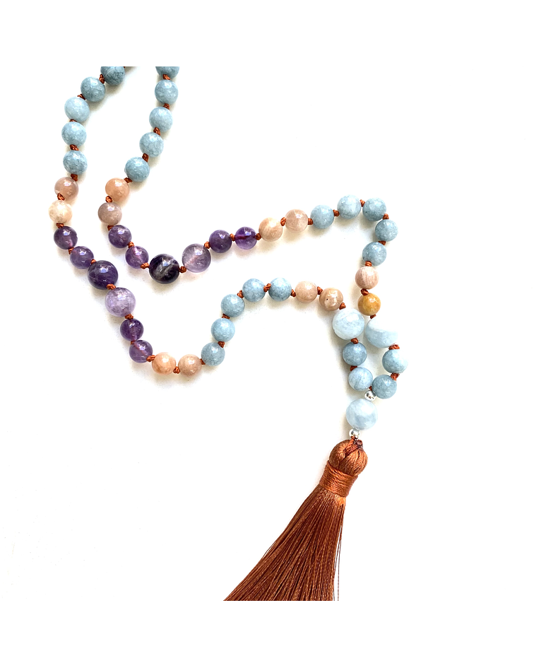 Descubre nuestro Japa Mala de 108 cuentas, diseñado para facilitar la comunicación con los ángeles y la divinidad. Este hermoso collar está compuesto por piedras naturales de aguamarina, amatista y piedra del sol, conocidas por sus propiedades energéticas. Estas piedras promueven una conexión más profunda con el mundo espiritual.