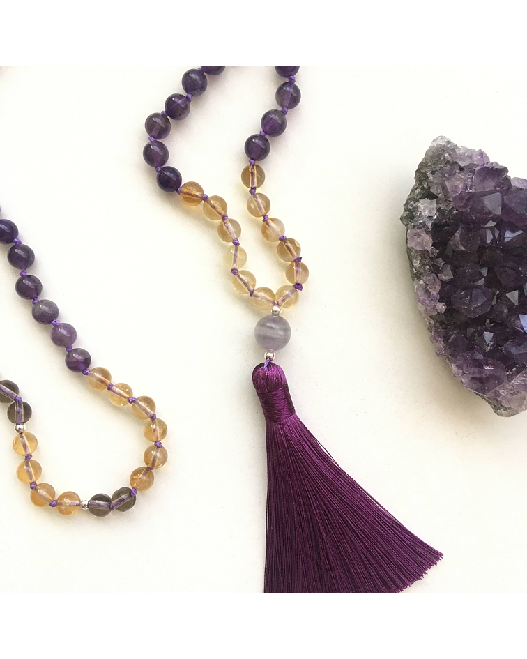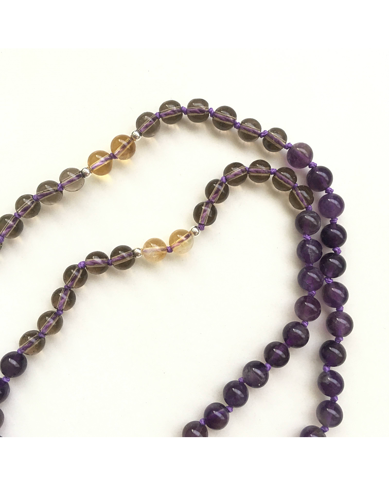 Japa mala de amatistas, cuarzo ahumado y citrino; cuarzos que concentran luz especial para conectar con campos superiores de consciencia y nuestros ángeles de protección.