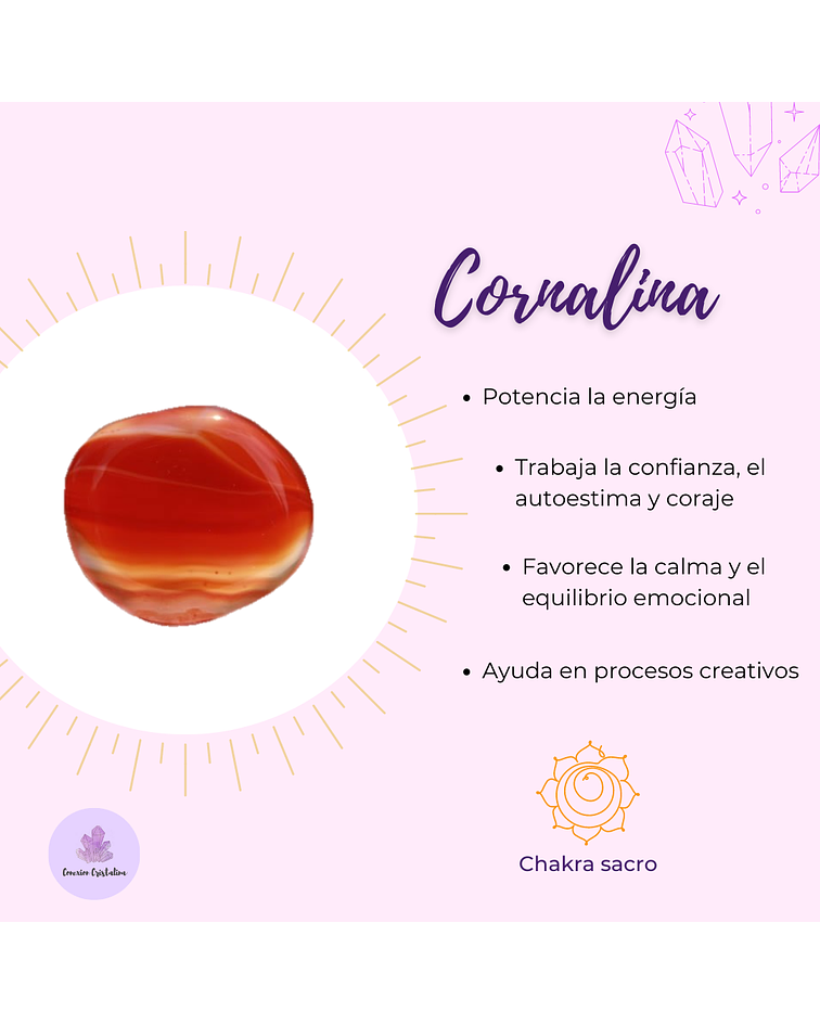 Piedra afín al segundo chakra, de la creación y pasión. Nos conecta con nuestra creatividad y sagrado femenino, equilibra y armoniza.