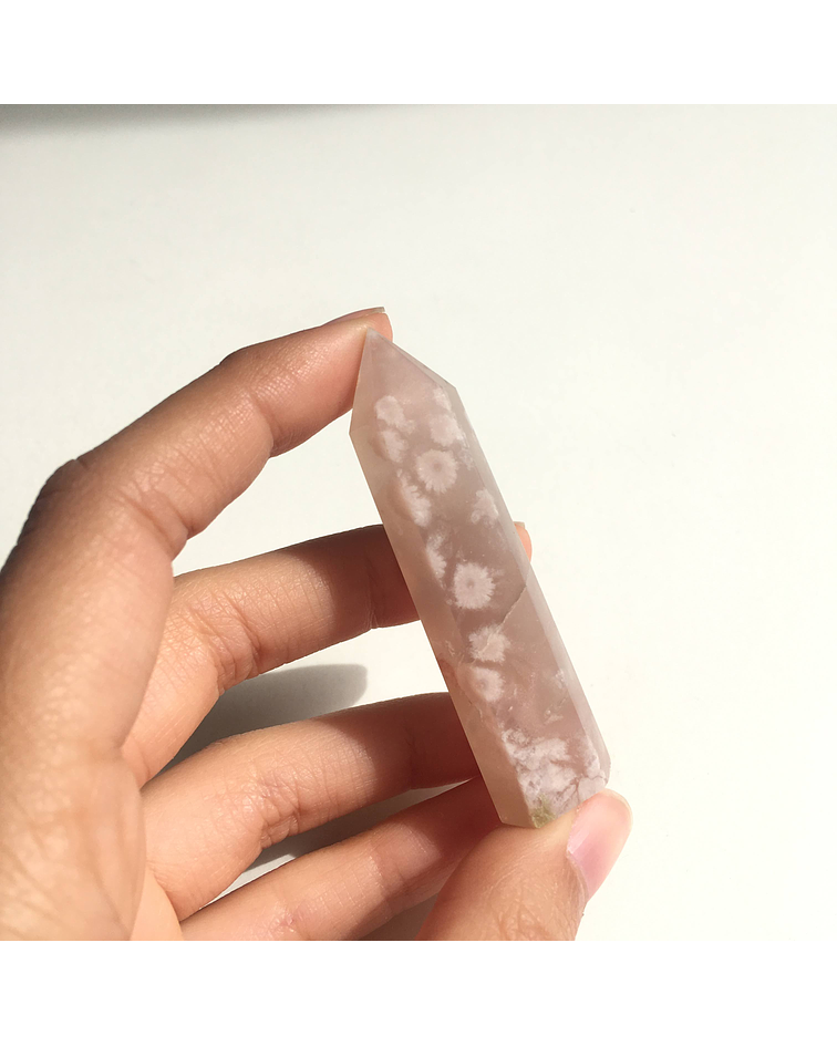 El ágata pertenece a la familia de los cuarzos y con sus sutiles tonos nos regala armonía y balance. Es una piedra de mucha energía creadora, que nos alegra. Esta bella variedad trae formaciones en su interior que parecieran ser flores, además de pequeñas drusitas que nos recuerdan nuestro brillo interno.
