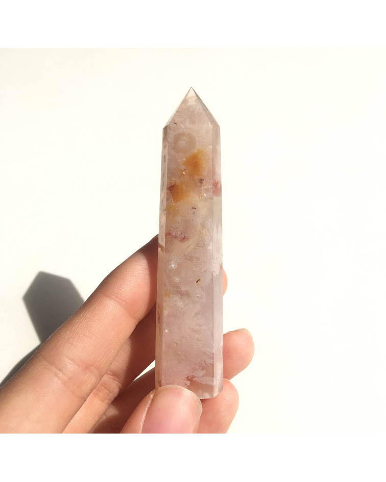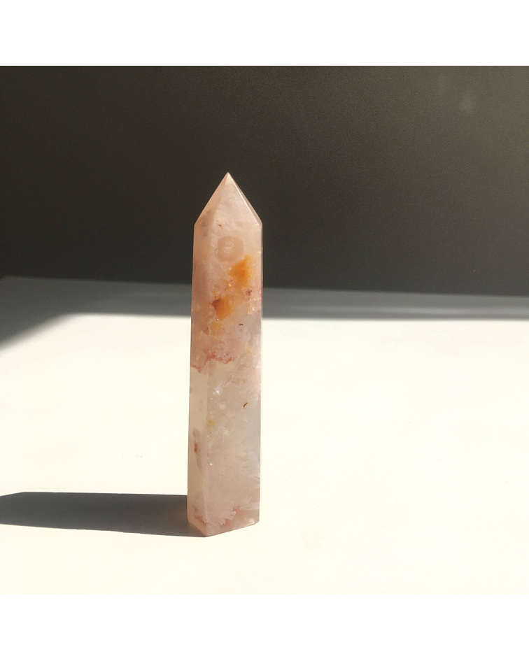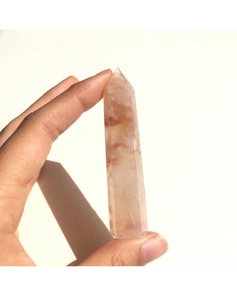 El ágata pertenece a la familia de los cuarzos y con sus sutiles tonos nos regala armonía y balance. Es una piedra de mucha energía creadora, que nos alegra. Esta bella variedad trae formaciones en su interior que parecieran ser flores, además de pequeñas drusitas que nos recuerdan nuestro brillo interno.